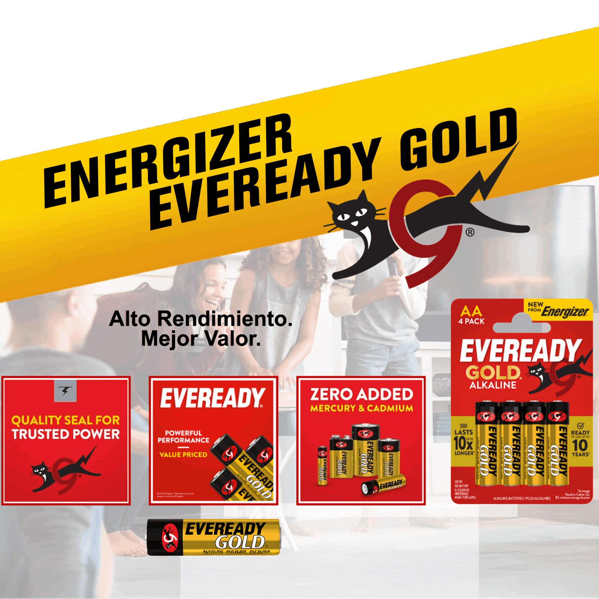 EVEREADY® es una empresa con más de un siglo de experiencia en la fabricación de baterías confiables, dedicada a ofrecer soluciones de energía portátil para el uso diario de las familias. Su línea EVEREADY GOLD® incluye productos en tamaños AA, AAA, C, D y 9V, diseñados para alimentar dispositivos de bajo a medio consumo, como controles remotos, radios, calculadoras y juguetes motorizados. Además, la marca ofrece un surtido de pilas miniaturas de alto rendimiento, ideales para dispositivos electrónicos, relojes, cámaras, equipos médicos y llaves remotas, con modelos como CR2016, CR2025, CR2032 y A76. Desde 1896, EVEREADY® se ha destacado por su compromiso con la calidad, la durabilidad y la innovación, brindando energía confiable para cada familia, en cualquier lugar y todos los días.